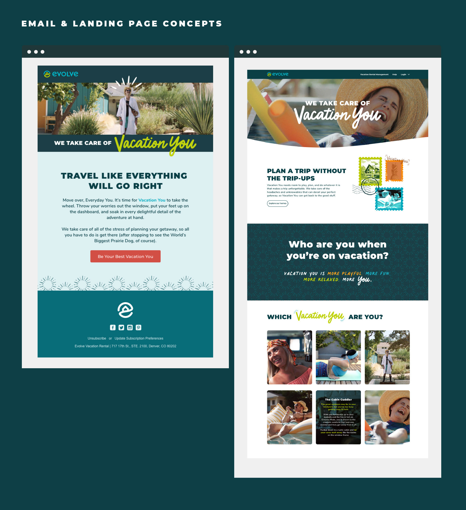 Vacation You was Evolve’s first brand awareness campaign, anchored by video advertising on platforms including Vudu, Hulu, and YouTube. My role was to establish a consistent, recognizable campaign identity that could flex seamlessly across channels — from video to email to social media. The campaign drove strong results, including a 71% increase in branded search impressions, and the 30-second video ad earned Judge’s Choice at the Ad Club CO Awards in 2023.