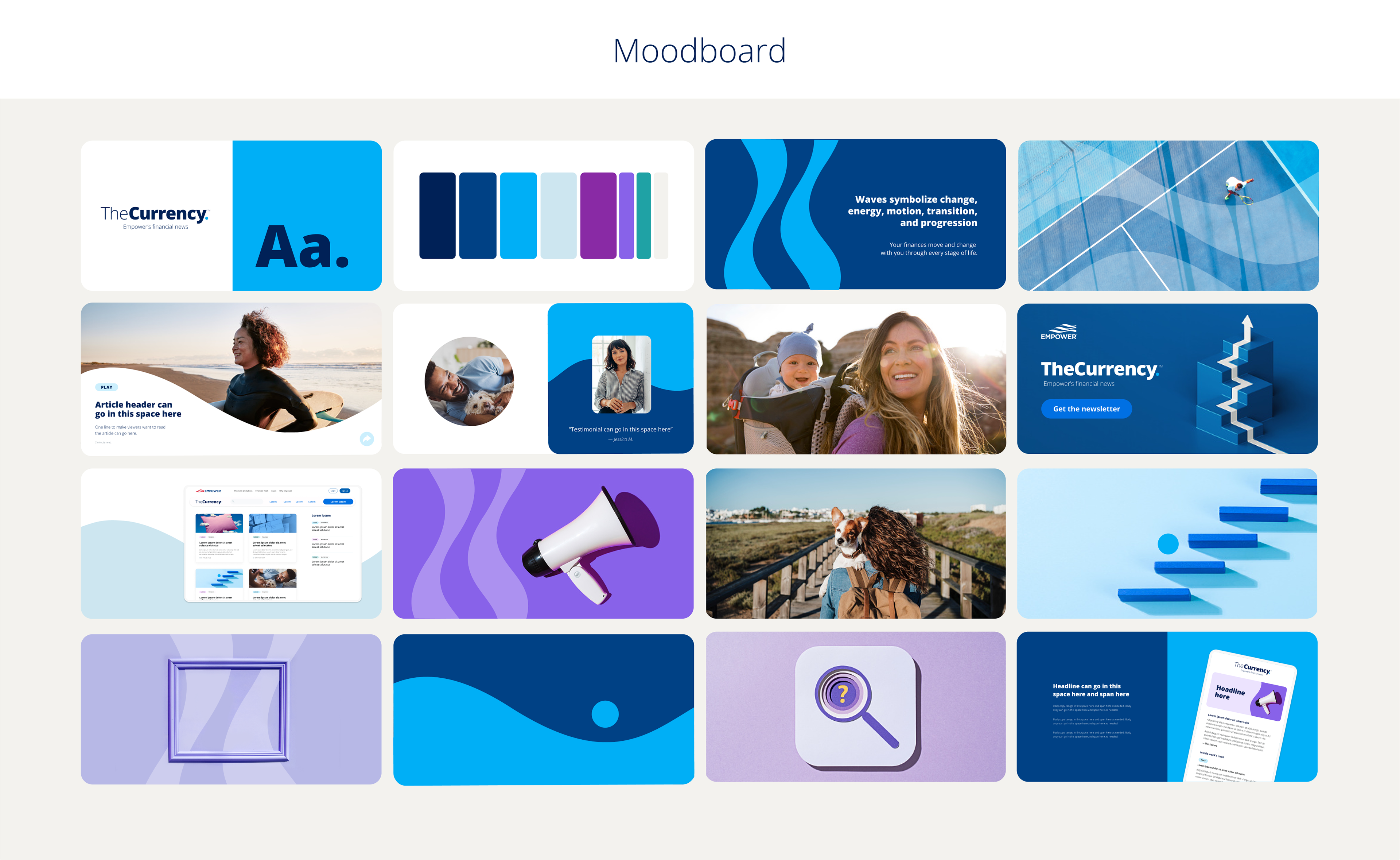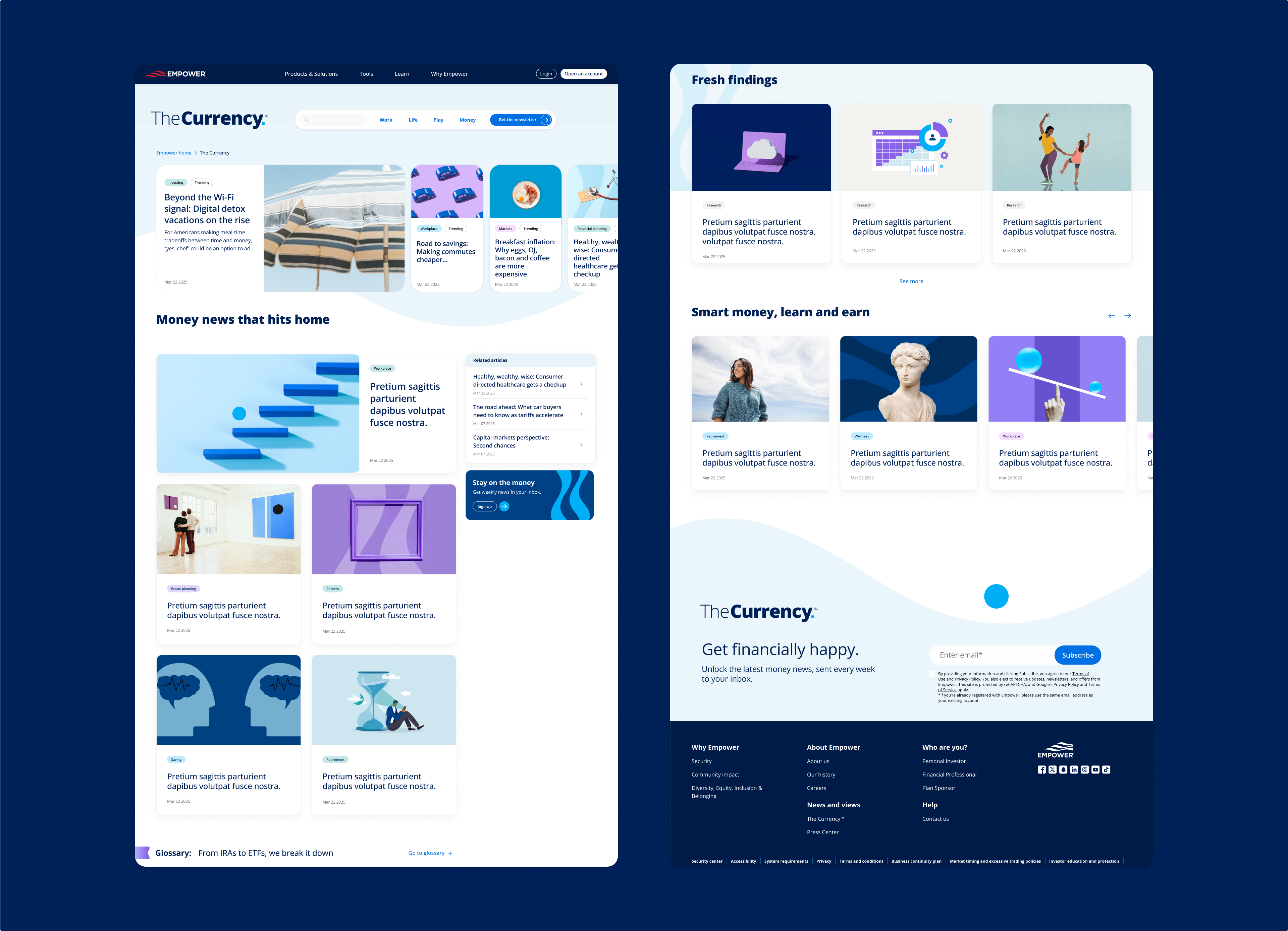 The Currency™, Empower’s financial news and insights platform, plays a critical role in shaping how audiences understand money’s influence on daily life. Tasked with developing a visual identity that positioned The Currency™ as both an editorial authority and a brand cornerstone, I collaborated with creative directors, UI/UX teams, and senior leadership to create a system anchored in Empower’s identity — yet unmistakably its own.